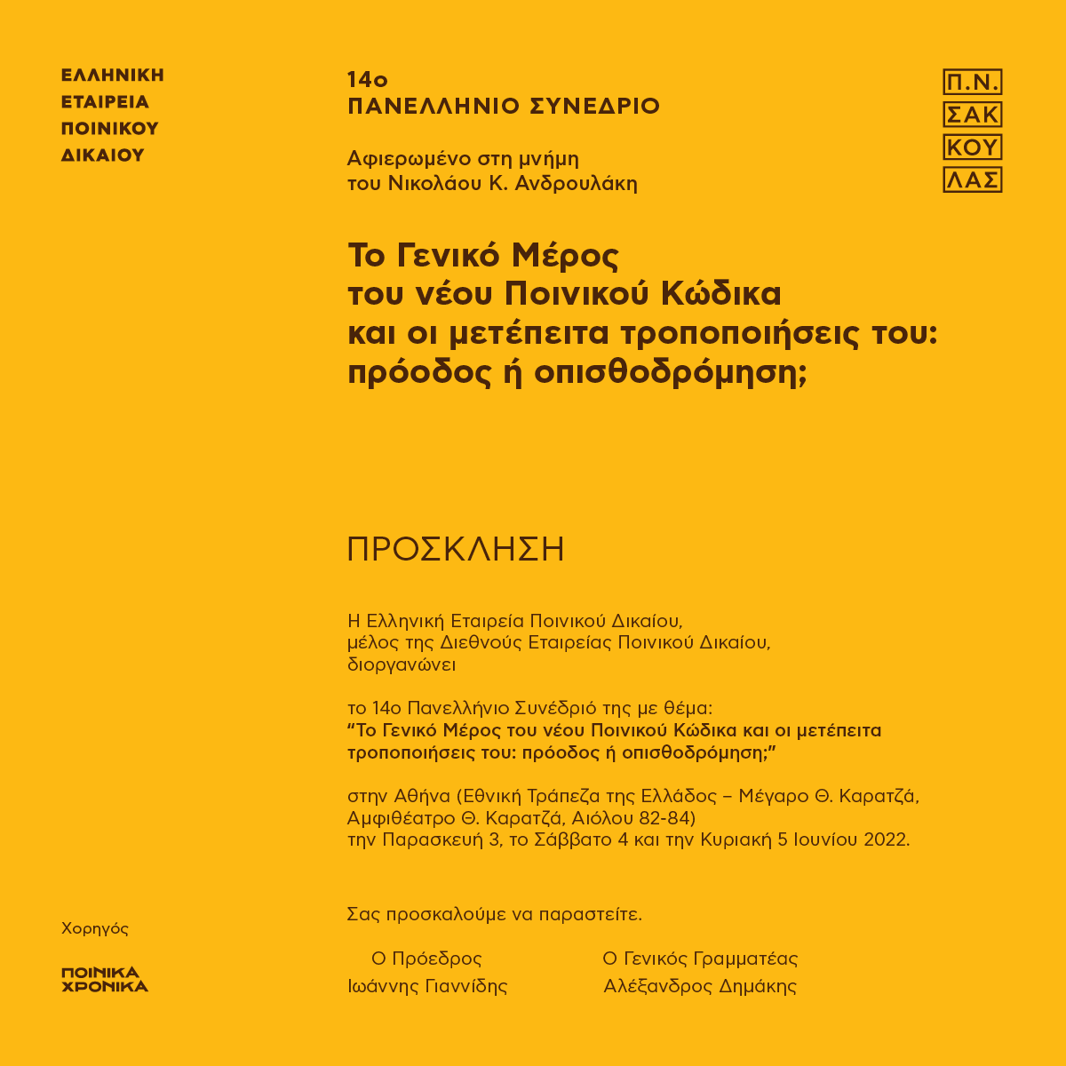 Η Ελληνική Εταιρεία Ποινικού Δικαίου, μέλος της Διεθνούς Εταιρείας Ποινικού Δικαίου, διοργανώνει το 14o Πανελλήνιο Συνέδριό της, με θέμα: «Το Γενικό Μέρος του νέου Ποινικού Κώδικα και οι μετέπειτα τροποποιήσεις του: πρόοδος ή οπισθοδρόμηση;»