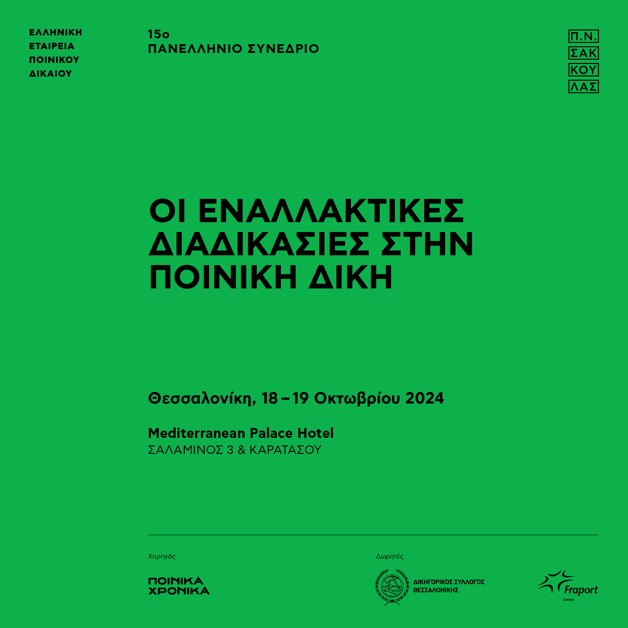 Η Ελληνική Εταιρεία Ποινικού Δικαίου, μέλος της Διεθνούς Εταιρείας Ποινικού Δικαίου, διοργανώνει το 15o Πανελλήνιο Συνέδριό της, με θέμα: «Οι εναλλακτικές διαδικασίες στην ποινική δίκη» στη Θεσσαλονίκη (Mediterranean Palace Hotel, Σαλαμίνος 3 & Καρατάσου), την Παρασκευή 18 και το Σάββατο 19 Οκτωβρίου 2024.